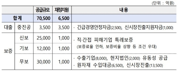 수출 정책금융으로 기업의 자금경색도 해소한다. 중소벤처기업진흥공단(3500억 원·대출)·신용보증기금(2조 5000억 원·보증)·기술보증기금(1조 2000억 원·보증)·한국무역보험공사(3조 원·보증) 등을 통해 약 7조 1000억 원의 수출 정책금융을 공급한다.