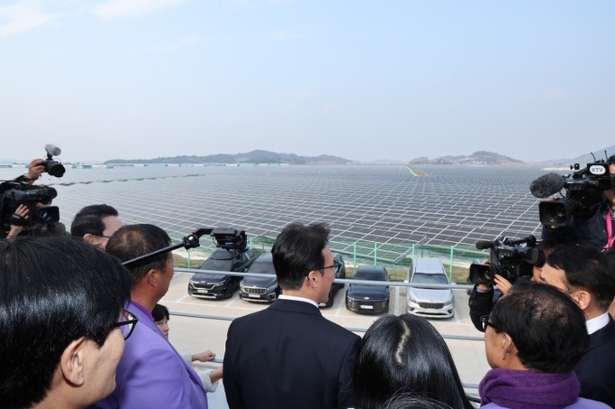 김민석 국무총리가 29일 전라남도 신안군 주민참여 태양광 현장인 안좌스마트팜앤쏠라시티를 방문, 발전 현장을 둘러보고 있다. 2025.12.29 (사진=연합뉴스)