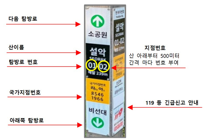 산악위치표지판 제대로 알기 (국가지점번호는 국토 및 이와 인전합 해양을 격자형으로 일정하게 구획하여 지점마다 부여한 고유번호로, 긴급상황에서 신속하고 정확하게 위치파악이 가능)