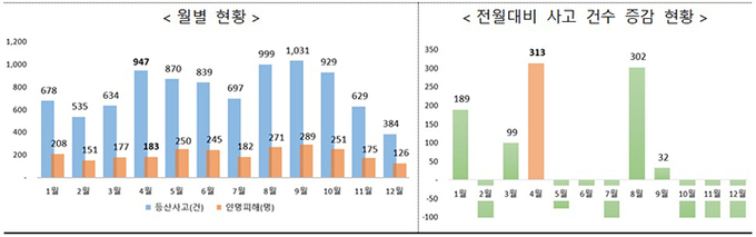특히 2024년 한 해 동안 발생한 등산사고는 총 9172건으로 이로 인해 2509명의 인명피해가 발생한 가운데, 4월에는 947건의 등산사고가 발생해 183명이 사망하거나 부상을 입었다.