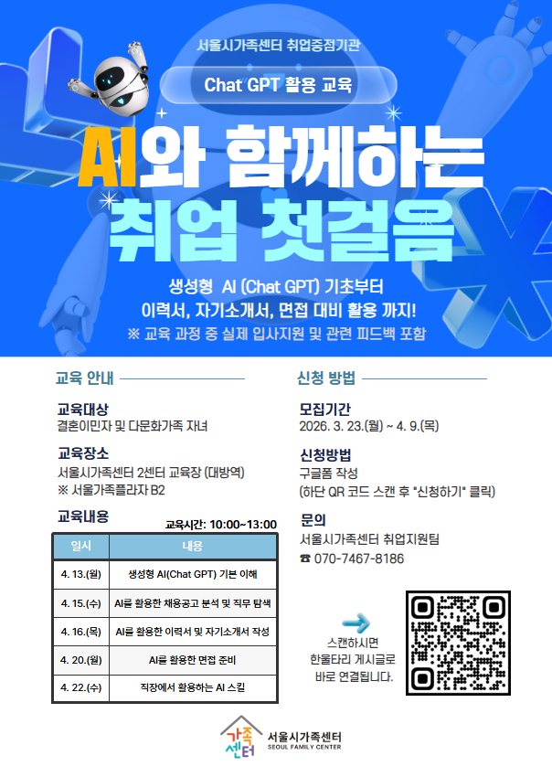 이번 교육은 4월 13일(월)부터 22일(수)까지 진행되며, 디지털 전환과 AI 기술 확산 등 변화하는 고용환경 속에서 참여자들이 새로운 흐름을 이해하고 이를 구직 과정에 자연스럽게 활용할 수 있도록 돕기 위해 마련됐다. 교육은 서울시 다문화가족 취업중점기관인 서울시가족센터에서 운영한다.