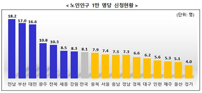 65세 이상 인구 1만 명당 신청자는 전남(18.2명), 부산(17.0명), 대전(16.6명) 순으로 높게 나타났다.
