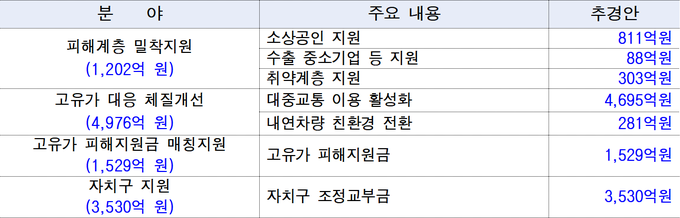 이번 추경의 주요 투자 분야는 ▴피해계층 밀착지원(1,202억 원) ▴고유가 대응 체질개선(4,976억 원) ▴고유가 피해지원금 매칭지원(1,529억원) ▴자치구 지원(3,530억원) 이다.