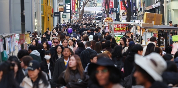 그룹 방탄소년단(BTS)이 정규 5집 '아리랑'(ARIRANG) 발매를 기념해 무료 공연 'BTS 컴백 라이브: 아리랑'(BTS THE COMEBACK LIVE|ARIRANG)을 여는 지난달 21일 서울 중구 명동거리가 인파로 북적이고 있다.(사진=연합뉴스)