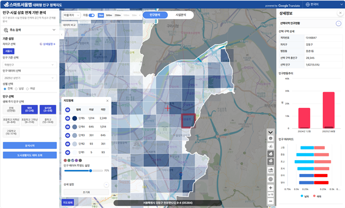 함께 공개된 ‘대화형 인구-정책지도’는 정책 수요를 보다 정밀하게 분석할 수 있도록 설계된 기능이다. 특히 0~17세 학령인구를 50m 단위까지 세분화해 제공하는 것은 전국 지자체 중에서도 서울시가 유일하다.