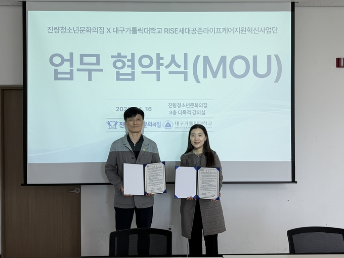 [경산/김근해기자] 진량청소년문화의집(관장 정민철)은 지역 청소년들에게 심리, 상담, 활동 등 다양한 경험을 지원하기 위하여 16일 대구가톨릭대학교 RISE 세대공존 라이프케어 지원혁신사업단과 업무협약을 체결하였다.