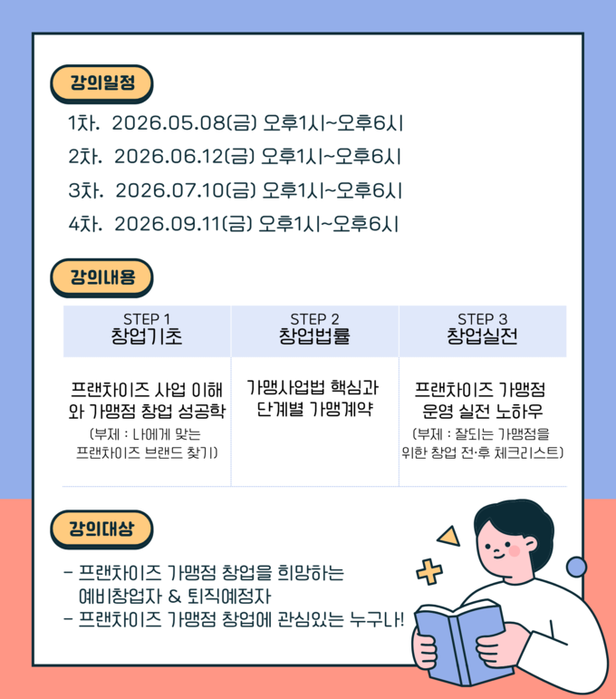주요 교육 내용은 ▲프랜차이즈 사업 구조 이해와 개인별 창업 환경 분석 ▲가맹사업법 및 단계별 계약 실무 ▲가맹점 운영 노하우 등으로, 예비 창업자의 실질적인 역량 강화에 도움을 줄 것으로 기대된다.