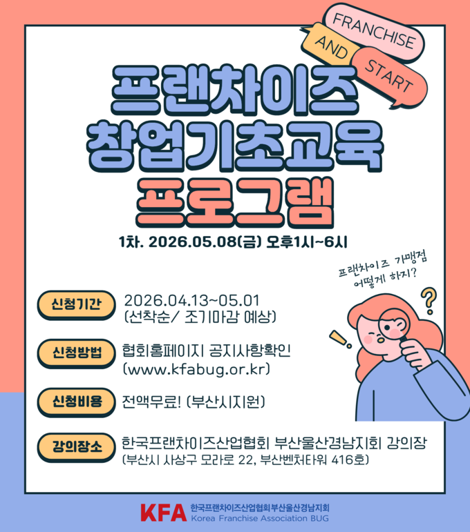 한국프랜차이즈산업협회 부산울산경남지회 누리집(www.kfabug.or.kr)을 통해 선착순으로 최대 80명을 모집한다.