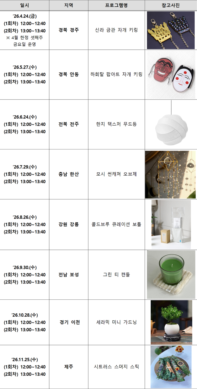4월부터는 경주 신라 금관 키링 만들기, 안동 하회탈 팝아트, 전주 한지 무드등, 한산 모시 공예, 강릉 커피 체험, 보성 녹차 활용 프로그램, 이천 도자 체험, 제주 감귤 활용 프로그램 등 지역별 특색을 살린 체험 콘텐츠를 순차적으로 운영한다.