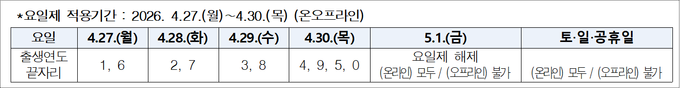*요일제 적용기간 : 2026. 4.27.(월)∼4.30.(목) (온오프라인)