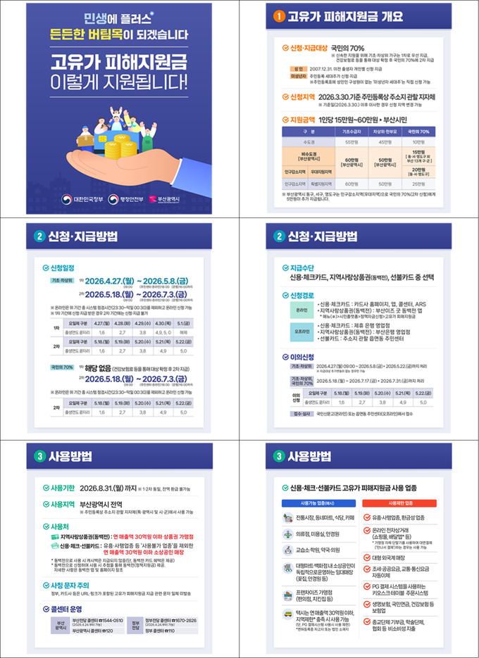 박형준 시장은 “이번 고유가 피해지원금은 최근 고유가와 고물가로 인해 가중된 시민들의 경제적 부담을 실질적으로 덜어드리기 위한 조치”라며, “특히 생활에 어려움을 겪는 취약계층을 우선적으로 보호하고, 민생 안정을 뒷받침하는 데 정책의 초점을 맞췄다”라고 전했다.