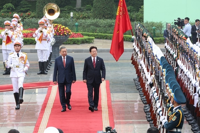 이재명 대통령과 또 럼 베트남 당서기장이 22일(현지시간) 하노이 주석궁 대정원에서 열린 국빈 방문 공식환영식에서 의장대를 사열하고 있다. 2026.4.22(ⓒ뉴스1)