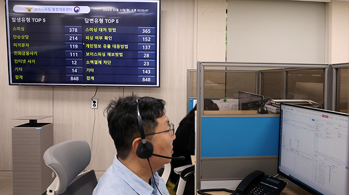 13일 오후 서울 종로구 전기통신금융사기 통합신고대응센터에서 열린 보이스피싱 상담원들이 업무를 보고 있다. 2024.5.14 (ⓒ뉴스1)