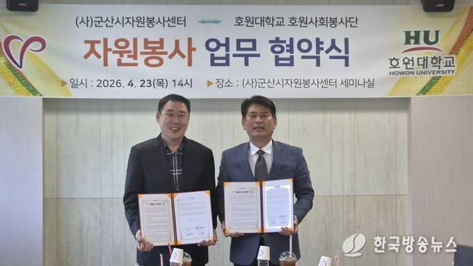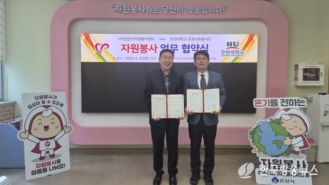 [군산/김주창기자] (사)군산시자원봉사센터(이사장 황진)는 4월 23일 군산시자원봉사센터 세미나실에서 호원대학교 호원사회봉사단(단장 서충길)과 지역사회 연계 봉사활동 활성화를 위한 업무협약(MOU)을 체결했다.