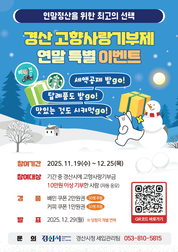 [경산/김근해기자] 경산시(시장 조현일)는 11월 19일부터 12월 25일까지 고향사랑기부제 연말 특별 이벤트를 진행한다고 밝혔다. 이번 행사는 고향사랑기부금에 대한 관심이 집중되는 연말에 특별 이벤트를 통해 고향사랑기부제의 활성화를 도모하기 위해 진행된다. 이벤트 대상은 기간 중 경산시에 고향사랑기부금을 10만 원 이상 기부한 사람이며, 추첨을 통해 50명에게 2만 원 상당의 배민 쿠폰을, 50명에게 1만원 상당의 커피쿠폰을 지급하며, 당첨자는 12월 29일에 개별 통보할 예정이다. 고향사랑기부제 참여방법은 경산고향사랑 홈페이지(www.gslove.kr)를 통해 온라인으로 기부하거나, 은행 앱(국민, 신한, 기업, 하나, NH올원뱅크)에서도 참여 가능하다. 또한 전국 농협은행에 직접 방문해 오프라인 기부도 가능하다.