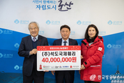 [군산/김주창기자] 석도국제훼리㈜(대표 김상겸)가 15일 지역 내 어려운 이웃을 위해 써달라며, 성금 4천만 원을 군산시에 기탁했다. 올해 ‘희망 2026 나눔 캠페인’에 동참한 석도국제훼리(주)는 2017년부터 꾸준하게 나눔을 실천해 연말연시 지역사회에 따뜻한 온기를 더하고 있다. 기탁식에 참석한 김상겸 대표는 “지역사회와 함께 성장해 온 기업으로서 나눔을 이어가는 것은 매우 중요한 일.”이라며 “작은 정성이 어려움을 겪고 있는 이웃들에게 힘이 되길 바라고, 앞으로도 의미 있는 사회공헌 활동을 지속하겠다.”라고 밝혔다. 강임준 군산시장은 “매년 꾸준하게 따뜻한 나눔을 실천해 주시는 석도국제훼리에 깊이 감사드린다.”라며 “기탁된 성금은 지역 내 취약계층의 겨울철 복지 향상을 위해 소중히 사용하겠다.”라고 전했다. 한편 소룡동에 소재한 석도국제훼리㈜는 군산과 중국 산동성 석도를 연결하는 정기 노선을 운항하며, 군산시의 국제 경쟁력 강화와 인적 교류 확대를 통한 관광 활성화, 상호 우호 증진, 군산항 국제 물동량 증가에 기여하고 있다.