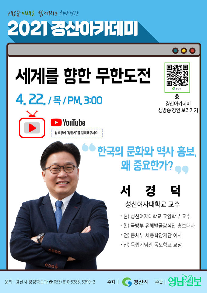 [경산/김근해기자] 경산시(시장 최영조)에서는 한국홍보전문가로 잘 알려진 서경덕 성신여대 교수가 오는 22일 “경산시 유튜브”로 실시간 생방송으로 진행한다고 밝혔다.