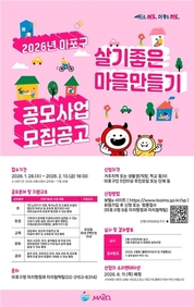 마포구(구청장 박강수)는 주민이 제안한 아이디어를 지원해 마을공동체 활성화를 도모하는 '2026년 마포구 살기좋은 마을만들기 공모사업' 참여 대상자를 2월 13일까지 모집한다. 신청 대상은 거주지 또는 생활권(직장·학교 등)이 마포구인 5인 이상 주민 모임 또는 단체로, 대표제안자 1인은 반드시 마포구 거주 또는 생활권임을 증빙해야 한다. 공모 분야는 효·환경·교육·문화·공유 5개로 진행되며, 구는 분야별 2∼3개 팀을 선정해 팀당 최대 500만 원을 지원할 예정이다. 지원 항목은 마을활동 운영에 필요한 사업비와 실행인력(실무책임자) 활동비, 전문가 또는 마을활동가 초청을 위한 회의·강사비 등이다. 다만, 시설비·자산취득비 성격의 비용은 지원 대상에서 제외된다. 접수 기간은 1월 28일부터 2월 13일 오후 6시까지이며, 신청은 지방보조금관리시스템 '보탬e'를 통해 온라인으로 신청하거나 마포구청 자치행정과에 방문 접수할 수 있다. 공모사업은 서류 접수 후 2월 중 사전 인터뷰를 거쳐 3월 마을만들기위원회와 지방보조금관리위원회 심사로 최종 선정된다. 선정 결과는 4월 중 마포구 누리집을 통해 공지하고 개별 안내할 예정이다. 자세한 공모 내용과 신청 방법은 마포