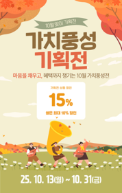 [경기/김명성기자] 경기도와 경기도주식회사가 공동 운영하는 경기도 공동 브랜드 ‘경기 착착착’이 10월 할인 이벤트를 펼친다. 경기도주식회사는 10월 2일부터 10월 10일까지 ‘노인기업 특가전’과 10월 13일부터 10월 말일까지 ‘가치풍성 특가전’을 진행한다고 2일 밝혔다. ‘노인기업 특가전’은 노인일자리전담기관에서 생산된 들기름, 쌀과자등 총 102여개의 제품을 최대 25% 할인(최대 5만원)하는 것이 골자다. ‘가치풍성 특가전’은 신선·건강식품으로 구성된 1,200여개 기획전 상품을 최대 15% 할인 판매한다. 역시 1인 2매까지 할인 쿠폰을 제공하며 최대 5만원까지 할인 가능하다. 이와 함께 경기도주식회사는 신규 판매 업체에 대한 이벤트도 마련했다. ‘착착착’ 온라인 쇼핑몰에 신규 입점한 업체 제품에 대해 매주 수요일 오전 10시부터 오후 5시까지 최대 50% 할인을 제공한다. 또 제품을 구매한 소비자들을 대상으로 정성스러운 리뷰를 선정해 5천원 할인 쿠폰도 지급할 계획이다. 경기도주식회사 관계자는 “경기도 공동브랜드 착착착의 질 좋은 제품들을 할인된 가격으로 구매하고, 가치 소비에 동참하셨으면 좋겠다”고 말했다.