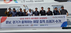 [충남/오창환기자] 베이밸리로 이어진 충남도와 경기도가 깨끗한 서해 바다 조성을 위해 다시 한 번 힘을 합쳤다. 도는 1일 당진 대난지도 인근 해역에서 경기도와 해양 침적쓰레기 공동 수거 활동을 진행했다고 밝혔다. 이번 공동 수거 활동은 2022년 9월 ‘베이밸리 건설을 위한 충남-경기 상생 협력 업무협약’ 체결 이후 4번째로, 전상욱 도 해양수산국장, 박종민 경기도 농수산생명과학국장, 늘푸른충남호와 경기청정호 직원 등 40여 명이 참여했다. 수거는 침적해양쓰레기 수거선인 경기청정호가 대난지도 인근 해역에 가라앉은 쓰레기를 건져 올리면 환경정화운반선인 늘푸른충남호가 집하장으로 운반하는 방식으로 진행했다. 양 도는 해양쓰레기 수거·운반 기반을 공동 활용해 서해안 해양쓰레기 문제에 공동 대응하고, 경계가 불분명한 해상 침적·부유 해양쓰레기를 수거함으로써 깨끗한 서해 바다를 조성한다는 방침이다. 이날 도는 국제연안정화의 날(9월 20일)과 추석 명절을 맞아 보령·서산·당진·태안·홍성·서천 도내 6개 연안 시군에서도 정화 활동을 펼쳤다. 특히, 당진 도비도항 일원에서는 대산지방해양수산청, 당진시, 해양환경공단 대산지사, 평택해양경찰서, ㈜한국동서발전 등 유관기관과