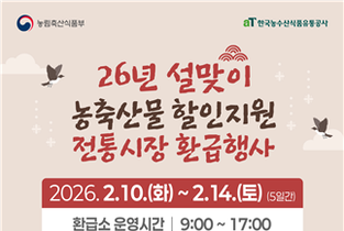 [한국방송/최동민기자] 행정안전부(장관 윤호중)는 설 명절 소비 특수를 활용해 2월 한 달간 ‘2026년 설맞이 마을기업 제품 판로 지원’을 추진한다고 밝혔다. 마을기업은 지역 주민이 지역자원을 활용한 수익사업으로 소득과 일자리를 창출하고 지역문제를 해결하는 마을단위 기업으로, 2011년부터 지정이 시작되어 2024년 기준 1,726개가 운영 중이다. 이번 지원은 온·오프라인 유통채널을 연계해 마을기업 제품의 인지도를 높이고, 명절 수요가 집중되는 설 연휴 전 2주∼연휴 후 1주 기간에 맞춰 홍보·판매 효과를 높이는데 중점을 둔다. <온라인 판로 지원> 먼저, 온라인 판로 지원을 위해 우체국쇼핑몰 내 ‘마을기업 전문관’을 개설·운영해 76개 마을기업 제품을 선보인다. 주요 상품으로는 설 명절 선물 수요가 높은 지역 특산 가공식품을 중심으로 전통 먹거리, 생활소품 등 온라인 배송에 적합한 제품으로 구성된다. 전문관에서는 쿠폰 발행을 통한 할인 판매를 비롯해 메인배너 광고, 메일링·앱푸시, 외부 채널 홍보 등 다양한 온라인 판로 지원이 제공된다. <현장(오프라인) 판로 지원> 서울교통공사와 협업하여 유동인구가 많은 지하철 역사 공간을 활용한