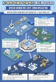 [한국방송/오창환기자] 화학산업을 2030년 세계 4위로 도약시키기 위해 수요기업과 중소기업, 연구소 등 130개 기관이 참여하는 화학산업 혁신 얼라이언스가 닻을 올렸다. 산업통상부는 23일 서울 소공동 롯데호텔에서 지자체와 산·학·연 관계자 150여 명이 참석해 화학산업 혁신 얼라이언스 출범식을 열어 'K-화학 차세대 기술혁신 로드맵 2030'을 발표했다. K-화학 차세대 기술혁신 로드맵 2030.(출처=산업통상부) 이번 로드맵은 현재 글로벌 5위인 한국 화학산업을 2030년 4위로 도약시키기 위한 실행전략을 담고 있다. 고부가 전환, 친환경 전환, 글로벌 환경규제 대응강화라는 3대 축을 중심으로 R&D와 인프라를 고도화해 핵심소재와 공정기술을 확보할 계획이다. 특히, 정부는 K-화학산업 내 M.AX 확산을 위해 소재 설계부터 제조 공정 전반에 AI를 활용한 기술개발과 기반구축을 지원할 예정이다. 신소재 개발 기간을 단축하기 위해 AI와 자동화 장비를 연계해 자율 실험체계를 구축하고, 원료 투입부터 중합·분리·후공정·가공에 이르는 공정 전 과정에 AI를 도입해 실시간으로 최적의 공정조건과 에너지 소비를 최소화하는 지능형 공정 제어 시스템을 구현하는