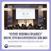[한국방송/김주창기자] 최근 방사선 피폭 사례를 계기로 현장 안전관리의 중요성이 강조되는 가운데 원자력안전위원회(위원장 최원호, 이하 원안위)는 방사선 안전문화에 대한 올바른 인식을 확산하고, 안전관리자의 실천 역량을 강화하기 위해 「2025년 하반기 방사선안전관리자 전국 포럼(이하 포럼)」을 14일(금) 서울 중구 더플라자호텔에서 개최하였다. 이번 포럼은 2021년 4월 첫 발대식 이후 11회째를 맞이하였으며, 산업·의료·교육 등 다양한 분야의 방사선안전관리자들이 한자리에 모여 현장의 경험과 우수사례를 공유하고, ‘안전은 현장에서 실천으로 완성된다’는 공감대 속에 안전한 방사선 이용 환경 조성을 위한 실천 의지를 다지는 자리로 마련되었다. 이날 행사에는 최원호 원안위 위원장, 김제남 한국원자력안전재단 이사장, 조병옥 한국방사선안전협회 이사장을 비롯해 방사선안전 유공자 및 전국의 방사안전관리자 등 약 200명이 참석해 자리를 빛냈다. 포럼에서는 방사선안전관리자의 자긍심을 높이고 안전문화 확산을 장려하기 위해 ‘방사선안전관리 우수기관(이하 우수기관*)’ 5곳과 ‘안전문화 확산 유공자**’ 1명에 대한 시상식이 진행되었다. * (방사선안전관리 우수기관) ①창원경