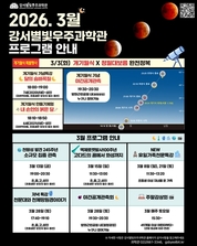 서울 강서구(구청장 진교훈) 강서별빛우주과학관(금낭화로 178)은 개기월식을 맞아 다채로운 천문 프로그램을 운영한다고 밝혔다. 한국천문연구원에 따르면 3월 3일(화) 정월대보름에 달이 지구의 본그림자에 완전히 가려지는 개기월식 현상이 예정된다. 이날은 지구 대기를 통과한 태양빛이 달을 붉게 물들여 보이게 하는 '블러드문'도 볼 수 있다. 오후 6시 49분 달 일부분이 가려지는 '부분식'이 시작되고, 달이 지구 그림자에 완전히 들어가는 '개기식'은 오후 8시 4분에 시작돼 9시 3분에 끝난다. 이번 월식은 끝날 때까지 육안으로 전 과정을 관측할 수 있다. 이에 강서별빛우주과학관은 '달의 숨바꼭질'을 주제로 ▲개기월식 기념 특강 ▲내 손안의 붉은 달 ▲야간공개관측 등 프로그램을 구성했다. 먼저, 3월 3일 오후 6시부터 1시간 동안 개기월식 현상에 대한 천문특강이 열린다. 정월대보름에 보이는 별자리 해설도 함께 진행된다. 같은 날 오후 6시 10분부터 '내 손안의 붉은 달' 체험 프로그램이 운영된다. 달의 변화 과정을 쉽고 재미있게 풀어내며, 달 모양 에코백 만들기 체험도 운영한다. 또, 오후 7시 30분부터 방화근린공원 원형광장에서 천체 망원경을 통해 개기월식