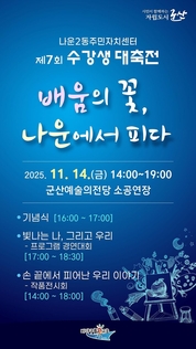 군산시 나운2동(동장 남귀우)과 나운2동 주민자치위원회(위원장 이백만)가 14일 군산예술의전당 소공연장에서 「제7회 수강생 대축전 – 배움의 꽃, 나운에서 피다」를 개최한다. 이번 대축전은 1년 동안 나운2동 주민자치센터에서 배우고 성장해온 주민들이 한자리에 모여 서로의 노력을 응원하고, 함께한 시간을 기념하는 배움의 축제이자 화합의 장이다. 2011년 신흥초등학교 강당에서, 단 7개 프로그램으로 첫발을 내디딘 대축전은 이제 15개 프로그램, 500여 명이 함께하는 군산의 대표적인 주민 축제로 성장했다. 무엇보다 이 대축전은 전국 최초로 주민자치센터 수강생들이 직접 주인공이 되어 만든 축제로, 지금은 여러 지역에서 벤치마킹하는 주민자치의 선진사례로 꼽힌다. 먼저 오후 2시부터 6시까지 소공연장 로비에서 6개 강좌(한국화·서예·뎃생&수채화·감성글씨·어반스케치·손발사랑) 수강생들이 준비한 손끝에서 피어난 우리 이야기, 작품전시회와 체험부스가 운영된다. 오후 4시 기념식에 이어, 9개 강좌(노래교실·다이어트댄스·라인댄스·밸리댄스·웰빙기체조·하모니카·우쿨렐레·통기타·중국어교실) 수강생들이 펼치는 프로그램 경연대회 ‘빛나는 나, 그리고 우리’가 펼쳐진다. 특별
