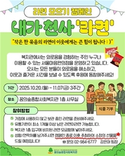 서울 강북구(구청장 이순희)는 관내 사회복지시설 꿈의숲종합사회복지관이 오는 10월 20일(월)부터 11월 7일(금)까지 3주간 라면모으기 캠페인 '내가 천사 라면'을 전개한다고 밝혔다. 꿈의숲종합사회복지관은 외로움과 고립감을 느끼는 누구나 편하게 들러 서로 이야기 나누고, 외로움 진단·상담과 관련 정보도 제공받을 수 있는 소통 및 상담 공간인 '서울마음편의점 강북점'을 운영하고 있다. 이번 캠페인은 이러한 운영 취지를 응원, 확산함과 동시에 외로움을 겪는 주민들에게 따뜻한 나눔을 전하고자 마련됐다. 기부자는 꿈의숲종합사회복지관 1층 사무실 입구에 설치된 모금함에 유통기한이 최소 1개월 이상 남은 라면을 기부할 수 있다. 외로운 주민들을 위한 응원 메시지도 남길 수 있으며, 이름과 연락처를 기재하면 캠페인 종료 후 추첨을 통해 소정의 선물이 제공될 예정이다. 복지관 관계자는 "작은 나눔이 모여 어려운 이웃에게는 큰 위로가 될 수 있는 만큼, 이번 행사는 주민들의 자발적 참여와 연대를 이끌어내는 계기가 될 것"이라며 "주민 여러분의 많은 관심과 참여를 부탁드린다" 전했다. 이순희 강북구청장은 "이번 캠페인은 단순한 기부를 넘어 서로의 마음을 나누는 따뜻한 공동체