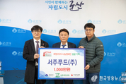 [군산/김주창기자] 서주푸드㈜(대표 고승주)는 24일 관내 어려운 이웃을 위해 써달라며 이웃돕기 성금 1,000만 원을 군산시에 전달하며 ‘희망 2026 나눔 캠페인’에 참여했다. 서수면에 소재한 서주푸드㈜는 지난 2011년부터 정기적으로 성금을 기탁하며 지역사회에 온정의 손길을 나누는 데 앞장서고 있다. 시는 전북사회복지공동모금회를 통해 성금을 관내 저소득 세대와 사회복지시설 및 단체 등 도움이 필요한 이웃들에게 소중히 지원할 예정이다. 기탁식에 참석한 고승주 대표는 “추운 겨울을 보내고 있을 소외된 이웃들에게 조금이나마 보탬이 되고자 성금을 마련했다.”라며, “앞으로도 지역사회와 상생하며 기업의 사회적 책임을 다하기 위해 꾸준히 노력하겠다.”라고 소감을 밝혔다. 강임준 군산시장은 “어려운 여건 속에서도 이웃을 위해 따뜻한 나눔을 실천해 주셔서 깊이 감사드린다.”라며, “보내주신 소중한 성금은 필요한 곳에 잘 전달하겠으며, 시에서도 소외된 이웃이 없도록 세심히 살펴나가겠다.”라고 전했다. 군산시는 2026년 1월 31일까지 ‘행복을 더하는 기부, 기부로 바꾸는 전북’이라는 슬로건 아래 ‘희망 2026 나눔 캠페인’을 이어가고 있다.